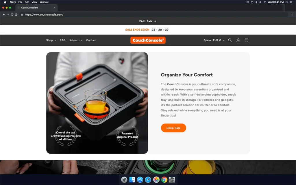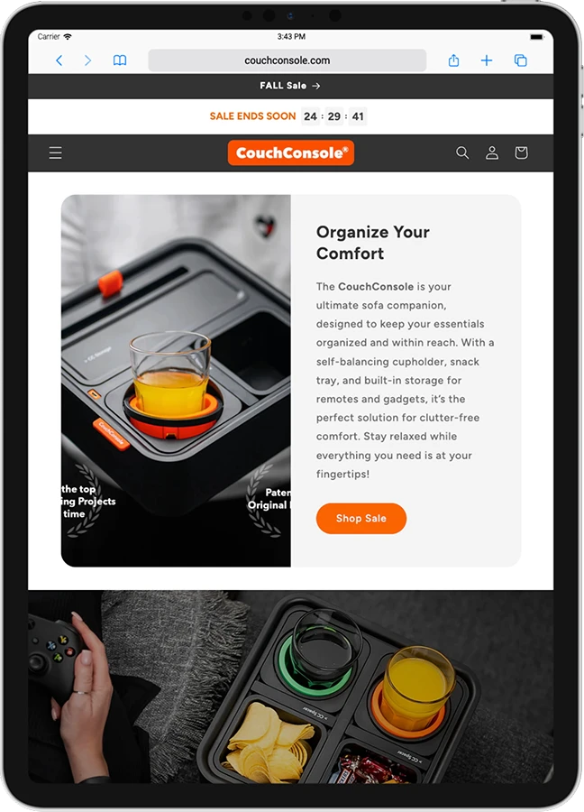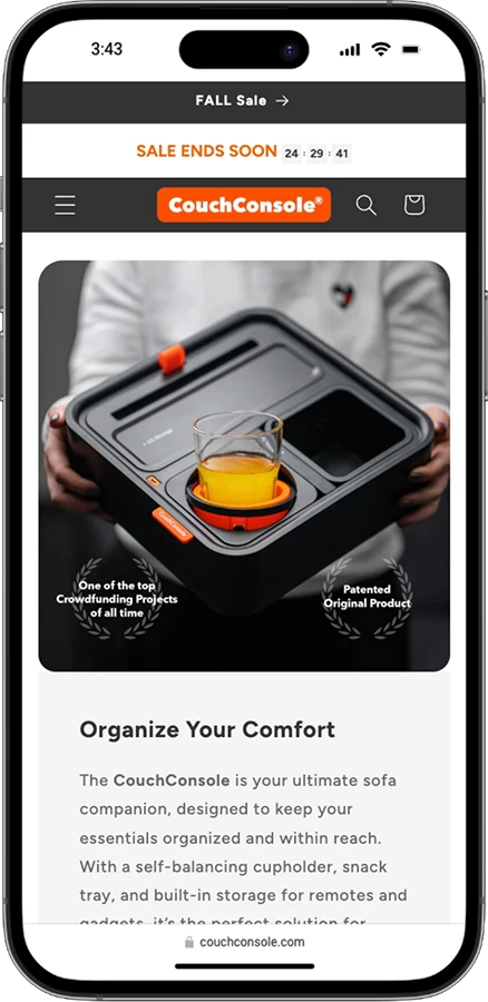 Así nació CouchConsole, un organizador modular para el sofá que incluye un portavaso antivuelco, un compartimento para snacks, un soporte para móviles o tablets y un bolsillo para objetos pequeños.