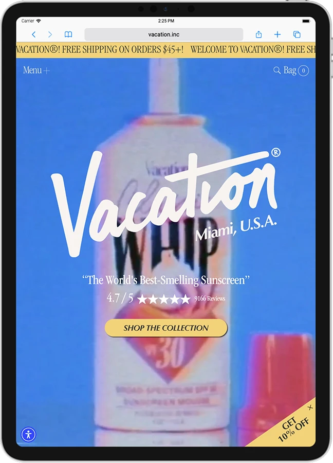 Fundada en 2021 por un trío de genios creativos –Marty Bell, Lach Hall y Dakota Green– que se juntaron gracias a un canal de Slack para fundadores, Vacation Inc. nació de una idea tan simple como brillante: ¿Y si hacemos que los productos de protección solar sean divertidos otra vez? Con el mundo en medio de la pandemia de COVID-19, estos muchachos decidieron que era el momento perfecto para agregarle un poco de alegría a nuestras vidas.
